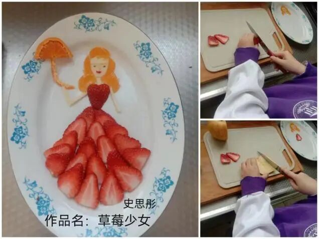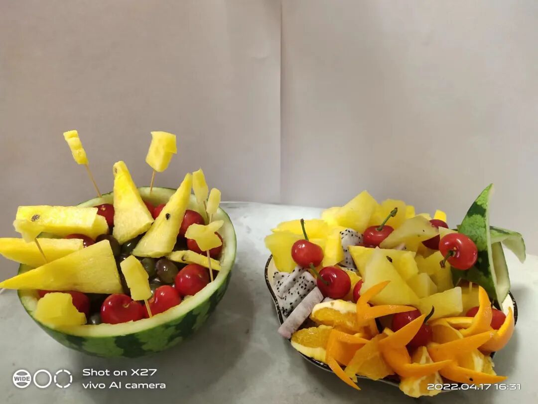 活动期间,同学们积极参与,制作出一个个精美的水果拼盘。